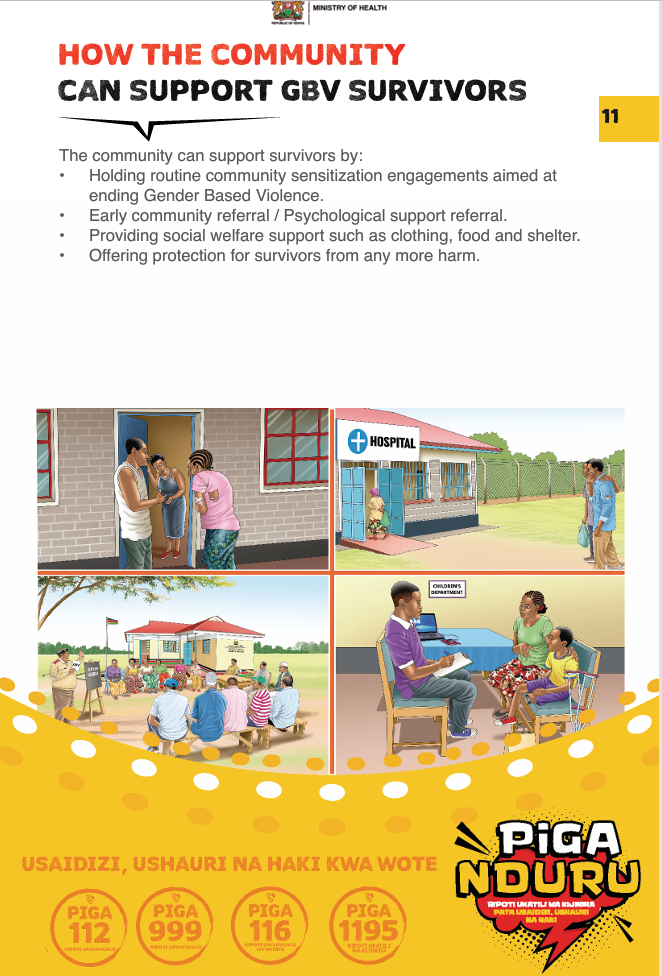 - Increase reporting of GBV cases: By raising awareness about the “Piga Nduru” campaign and encouraging community members to utilize the provided contact numbers.